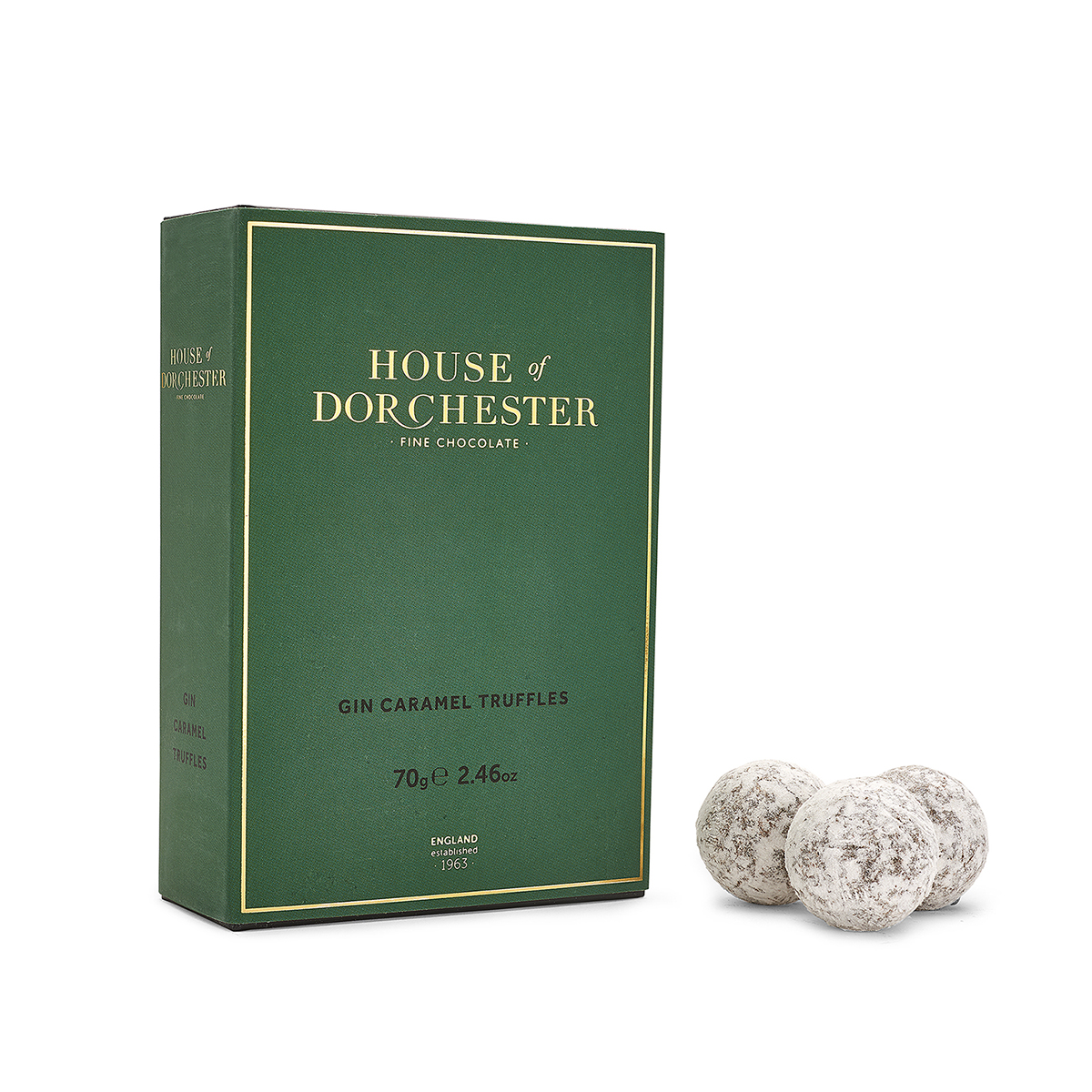 Dark chocolate with a gin caramel centre dusted in icing sugar and coloured sparkle.